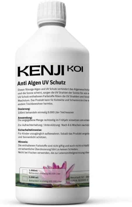 Η προστασία UV κατά των φυκιών KENJI KOI αποτρέπει αποτελεσματικά την ανάπτυξη των φυκιών. Η προστασία UV κατά των φυκιών KENJI KOI αποτρέπει αποτελεσματικά την ανάπτυξη των φυκιών. Μόλις οι θερμοκρασίες αυξηθούν και ο ήλιος λάμπει, οι ακτίνες UV του ήλιου προάγουν την αυξημένη ανάπτυξη των φυκιών. Οι χρωστικές που περιέχονται στην προστασία UV κατά των φυκιών φιλτράρουν τις ακτίνες UV και αναστέλλουν τη φωτοσύνθεση και την ανάπτυξη των φυκιών. Το προϊόν μπορεί να χρησιμοποιηθεί για λίμνες koi και λίμνες κολύμβησης και είναι ακίνδυνο για τα ψάρια και τους άλλους κατοίκους της λίμνης. Αποτρέπει την ανάπτυξη των φυκιών. Εύκολο στη χρήση. Επίσης κατάλληλο για λίμνες κολύμβησης. Δοσολογία: 100 ml επεξεργάζεται 8.000 λίτρα νερού λίμνης μία φορά. Εφαρμογή: Εφαρμόστε την καθορισμένη ποσότητα στις αρχές της άνοιξης για να επιτύχετε αποτελεσματική προστασία από τον ήλιο. Για συντήρηση/υποστήριξη: Επαναλάβετε την εφαρμογή μετά από 4-6 εβδομάδες ή μόλις η χρωστική ουσία μειωθεί. Οδηγίες ασφαλείας: Να φυλάσσεται μακριά από παιδιά. Μόλις ανοιχτεί, φυλάξτε το σε δροσερό, σκοτεινό μέρος. Προστατέψτε το από τη θερμότητα και το ηλιακό φως. Σημείωση: Οι χρωστικές που περιέχονται είναι μη τοξικές και δεν είναι επιβλαβείς για τα ψάρια, τα φυτά ή τους ανθρώπους. Μια τυχαία υπερδοσολογία δεν θα προκαλέσει καμία βλάβη. Μην το χρησιμοποιείτε σε ψάρια που προορίζονται για ανθρώπινη κατανάλωση.